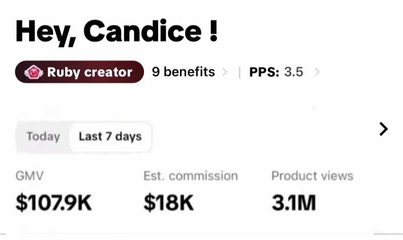 Screenshot of an online page showing statistics for a product or content creator named Candice, including benefits, PPS score, GMV, estimated commission, and product views.