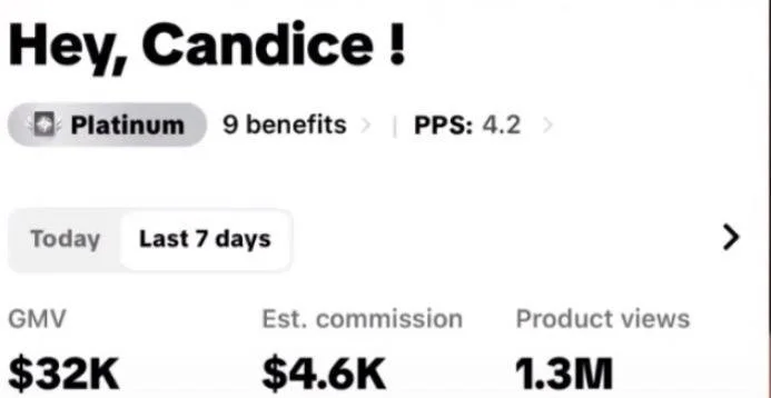 Social media analytics dashboard showing user Hey, Candice's account with a Platinum status, 9 benefits, PPS of 4.2, last 7 days view stats, GMV of $32,000, estimated commission of $4,600, and product views of 1.3 million.