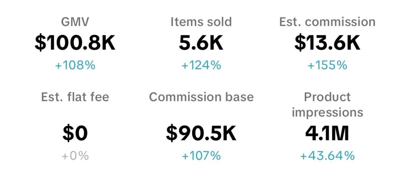 A business analytics dashboard showing metrics such as GMV of $100.8K, 5.6K items sold, and an estimated commission of $13.6K, with related percentage increases, along with estimated flat fee of $0, commission base of $90.5K, and 4.1 million product impressions.